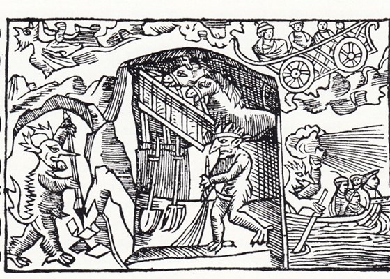 Billede fra Olaus Magnus' bog "Historie om de nordiske folk" fra 1550. Det er det ældste billede af en nisse i Skandinavien og det viser, at han gør rent i hestestalden.